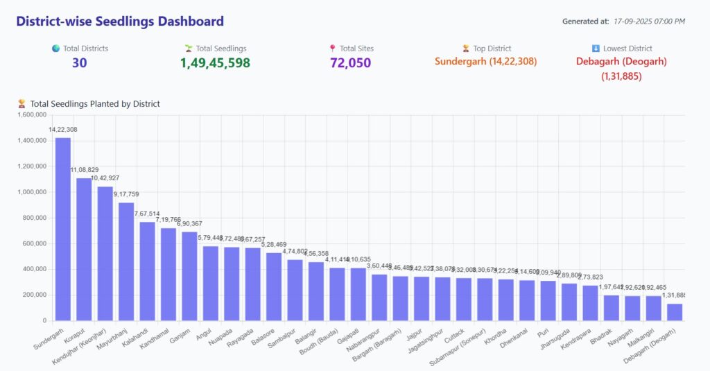 ओडिशा सरकार ने ‘एक पेड़ माँ के नाम 2.0’ अभियान के अंतर्गत राज्य भर मे 17 सितंबर 2025 को 75 लाख पेड़ लगाने का लक्ष्य तक रखा था, जिसे सरलतापूर्वक पूरा करके प्रधानमंत्री नरेंद्र मोदी को उनके 75वें जन्मदिन के अवसर पर उन्हें उपहार के रूप मे भेंट किया। अभी तक के सरकारी आकड़ों के अनुसार ओडिशा मे 17 सितंबर को 1.5 करोड़ पेड़ों को लगाया गया, जोकिं काबिलेतारीफ है और अन्य राज्यों को इससे प्रेरणा लेनी चाहिए। पिछले साल ओडिशा इस कार्यक्रम के तहत 63 लाख पेड़ों को लगाकर देश मे चौथे पर रहा।