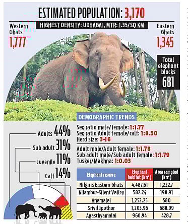 हाथियों की संख्या की गणना मई मे की गई थी जिसका रिपोर्ट अक्टूबर मे पेश किया गया। सर्वेक्षण मे 26 वन प्रभागों को शामिल किया गया था जिसमे बाघ अभयारण्य, वन्यजीव अभयारण्य, प्रादेशिक वन प्रभाग और राष्ट्रीय उद्यान को शामिल किया गया था। सर्वेक्षण मे मुदुमलाई बाघ अभयारण्य मे सबसे अधिक घनत्व 135 प्रति की.मी( लगभग 325 हाथी) दर्ज किया गया जिसके बाद गुडालुर वन प्रभाग और अन्नामलाई टाइगर रिजर्व का स्थान रहा।