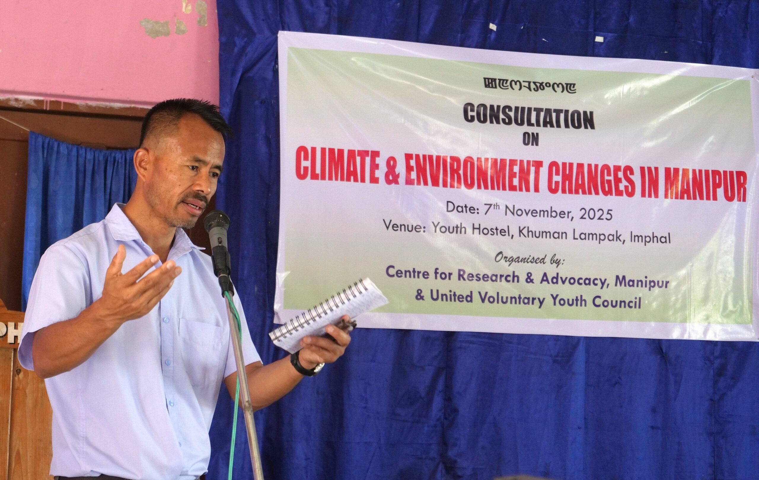 आज मणिपुर के इम्फाल मे स्थित खुमान लम्पक युवा छात्रावास में जलवायु और पर्यावरणीय परिवर्तन पर एक परामर्श का आयोजन किया गया। इस कार्यक्रम का आयोजन मणिपुर अनुसंधान एवं वकालत केंद्र द्वारा संयुक्त स्वैच्छिक युवा परिषद, मणिपुर के सहयोग से किया गया था। इस परामर्श में मणिपुर में जलवायु और पर्यावरणीय परिवर्तनों के स्वरूप और प्रभावों तथा जलवायु परिवर्तन के प्रभावों से निपटने में स्थानीय लोगों की भूमिका पर चर्चा की गई।